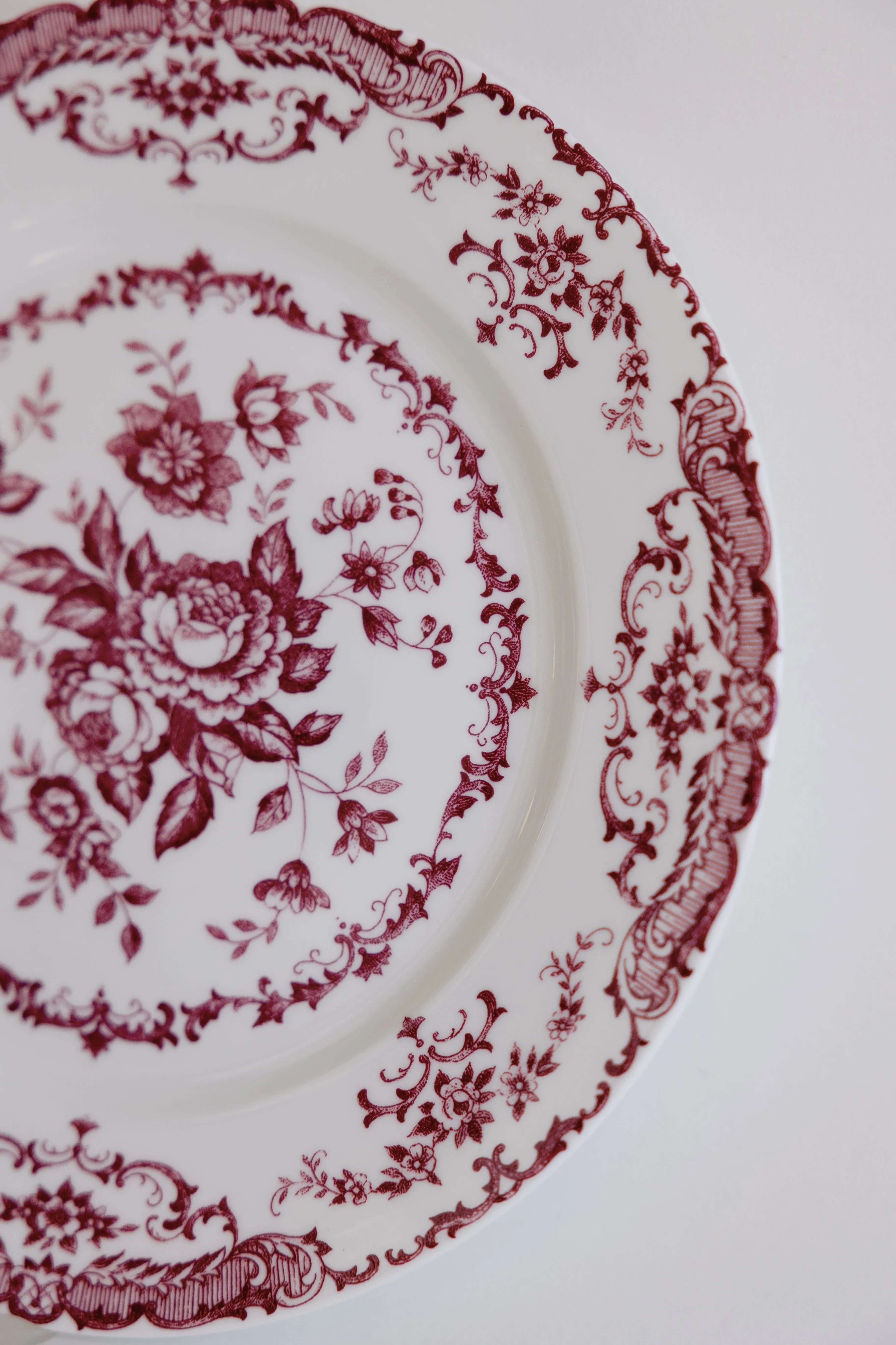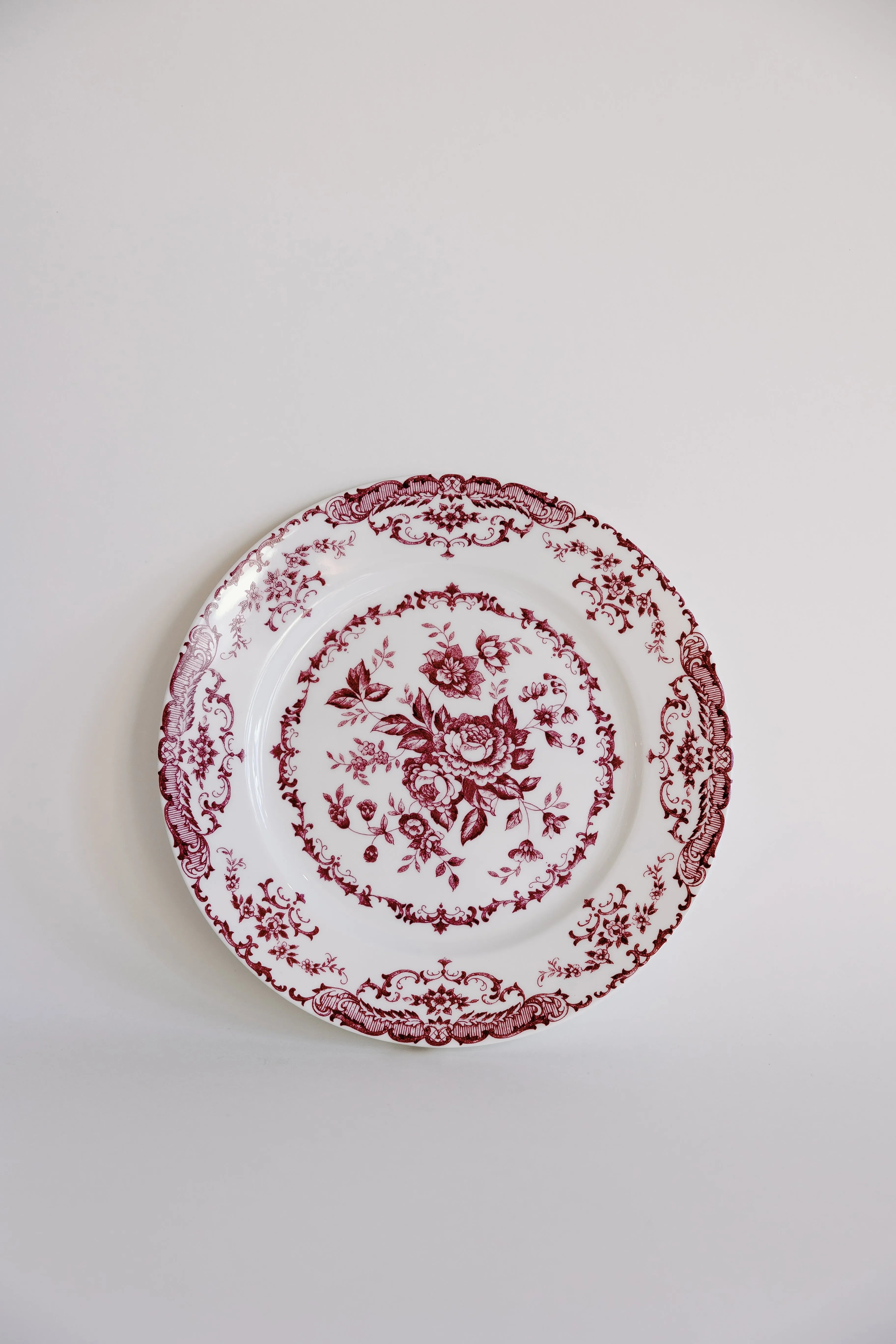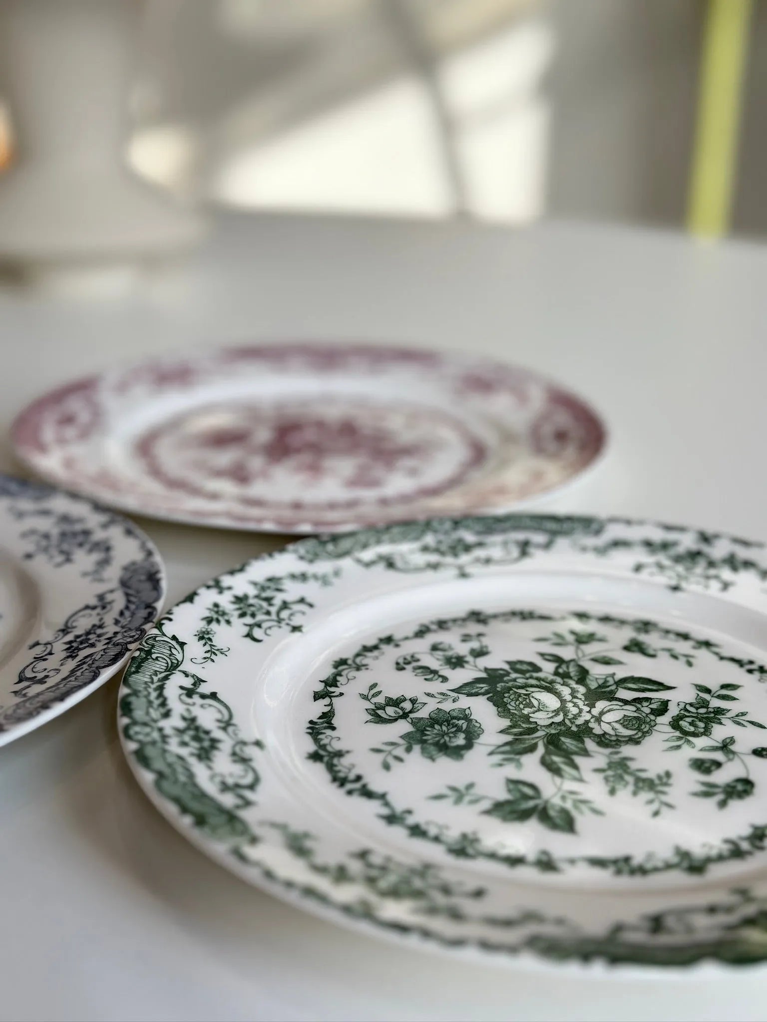 Add a touch of vintage charm to your table with accent dishes featuring a delicate floral border pattern. Available in three colors - midnight blue, magenta, and sage green - each plate showcases a classic French floral design against crisp white ceramic.