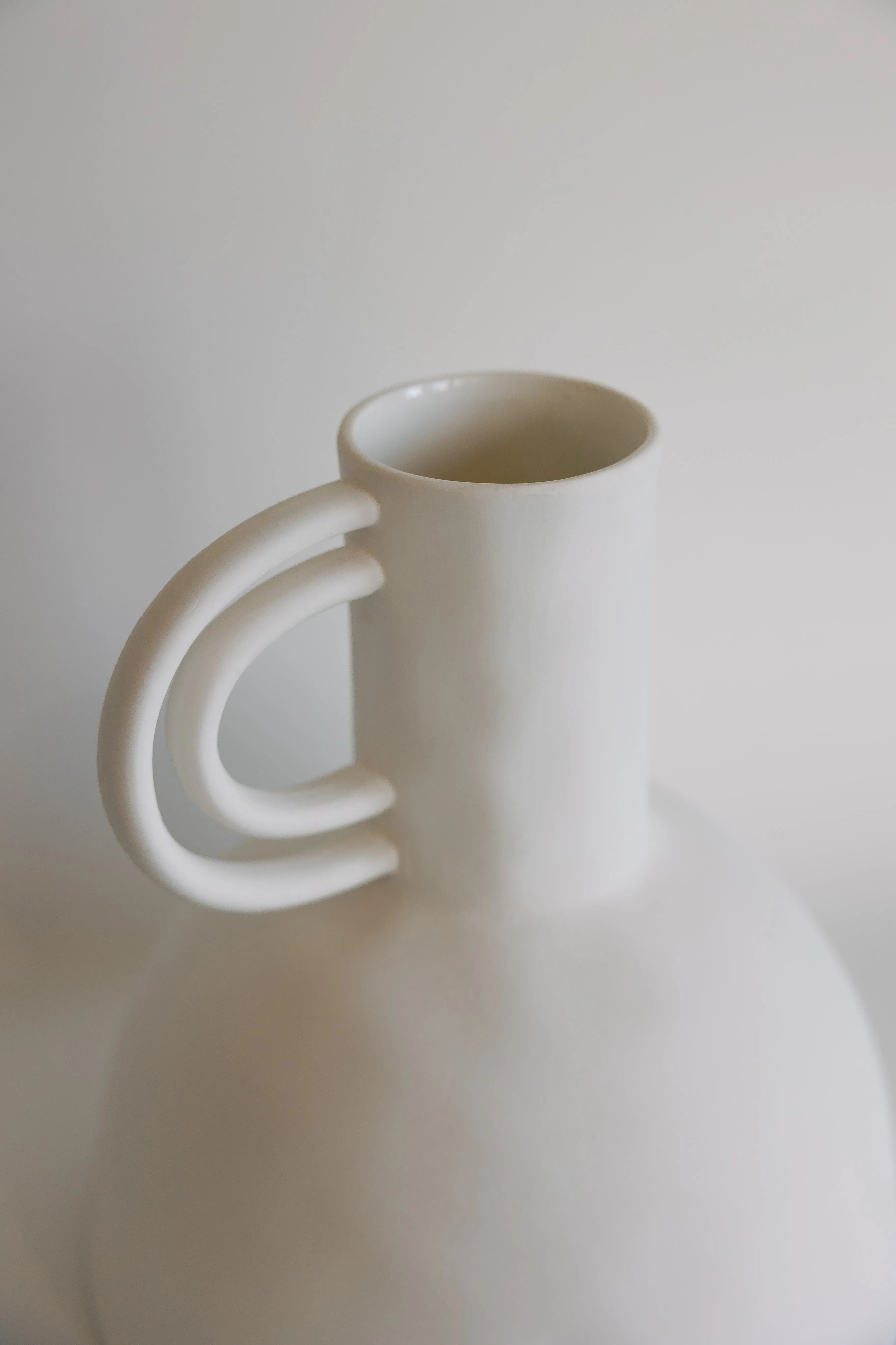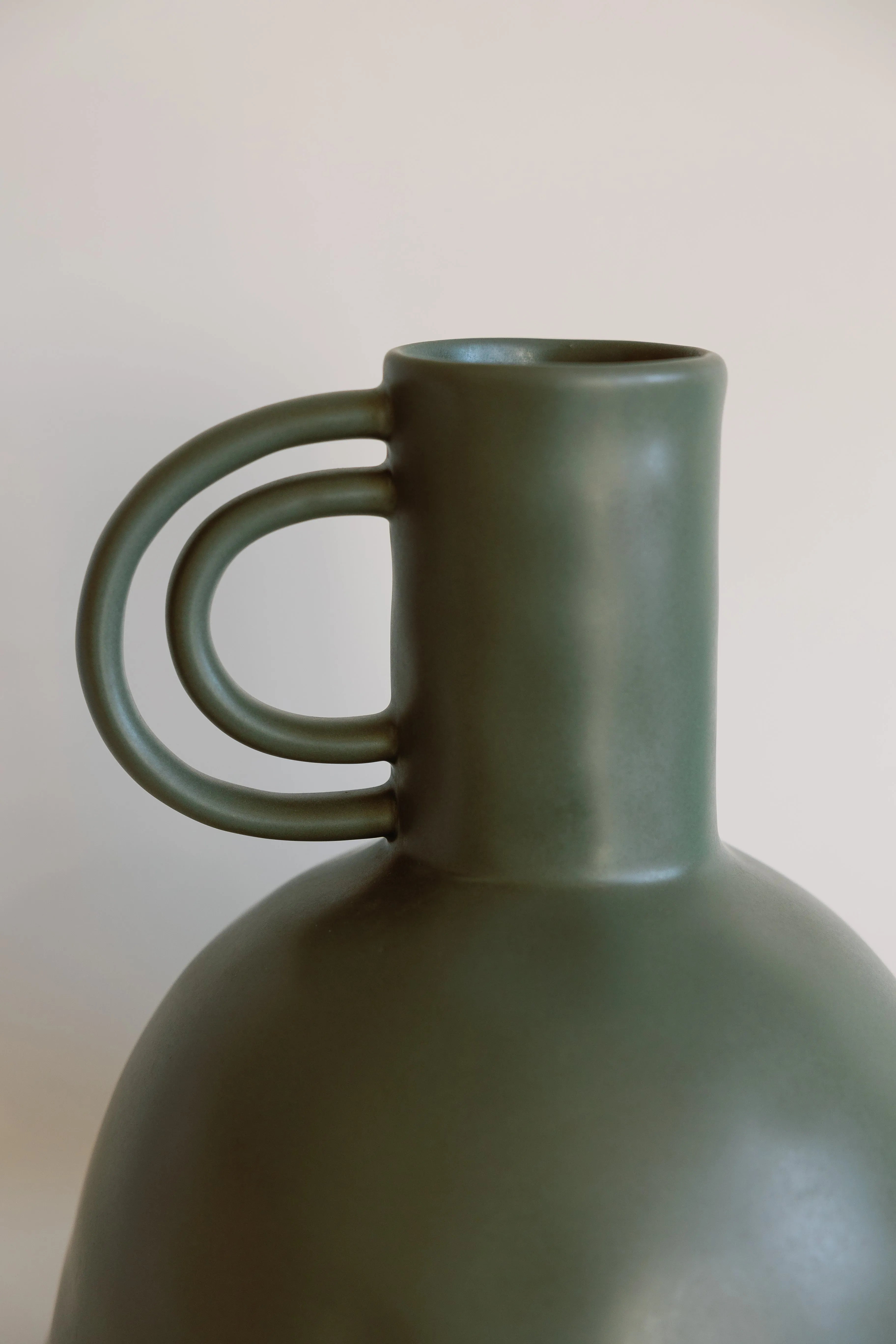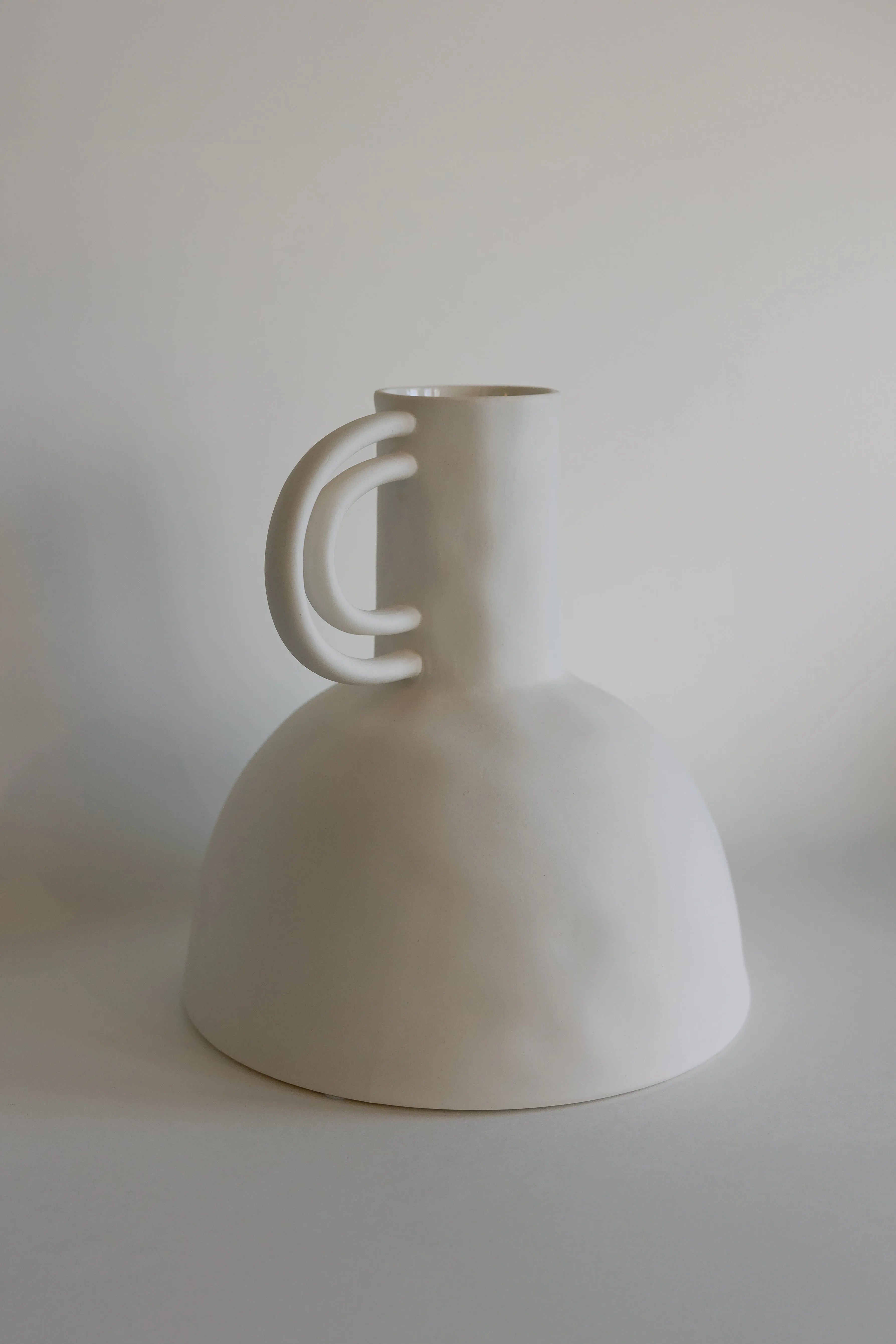Drawing inspiration from traditional water vessels, this ceramic vase combines the refined curves and functional beauty of a carafe with sophisticated ceramic craftsmanship. Its generous dome-shaped base flows into a graceful neck, accented by a distinctive loop handle that adds both visual interest and a touch of architectural flair.