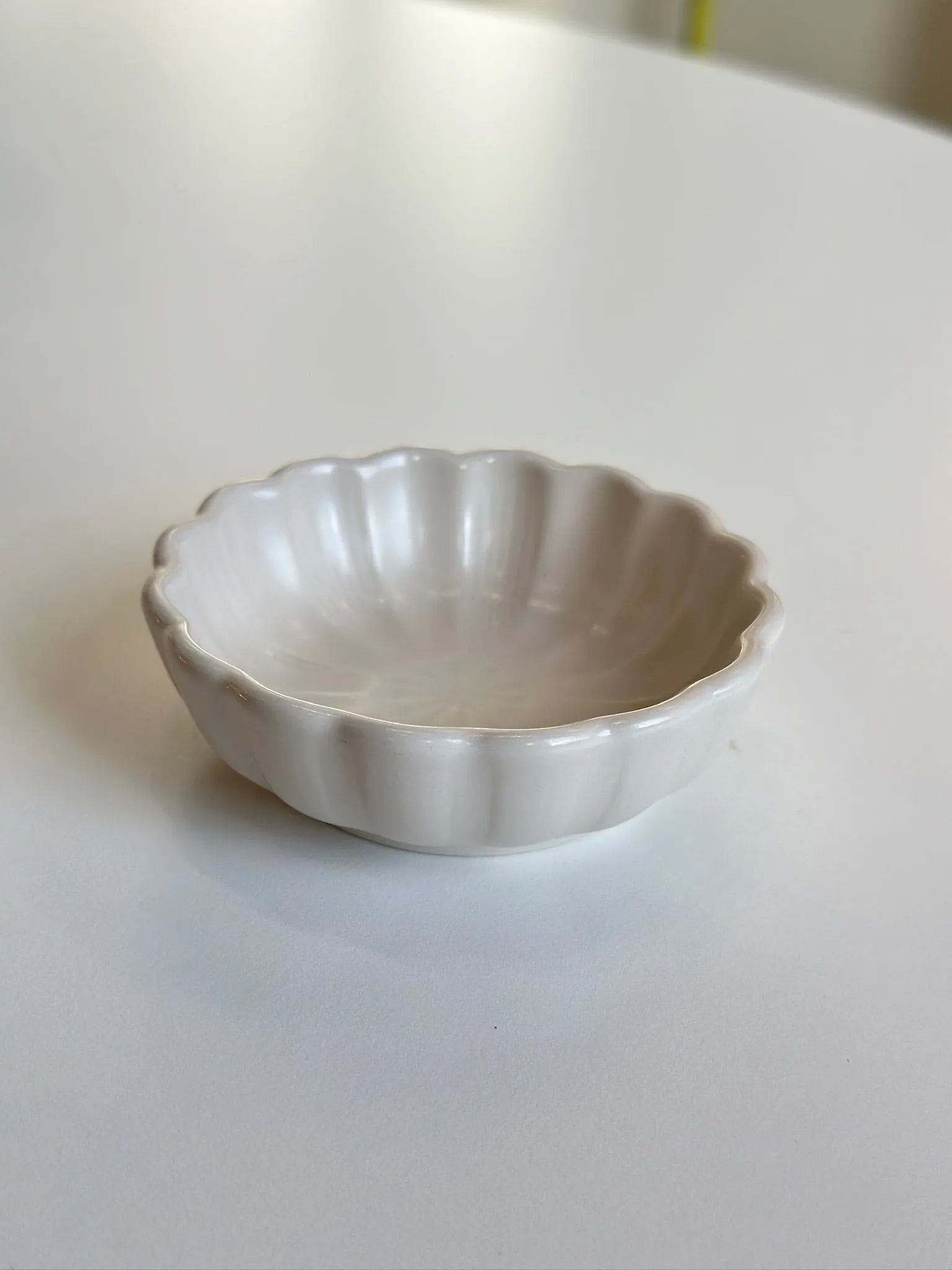 Add a touch of elegance to your dining experience with our Scalloped Blossom Sauce Dish. Crafted in pure white ceramic, this delicate dish features graceful scalloped edges reminiscent of flower petals, with gentle ribbing that adds subtle texture and visual interest. Perfect for serving dipping sauces, condiments, or small appetizers.